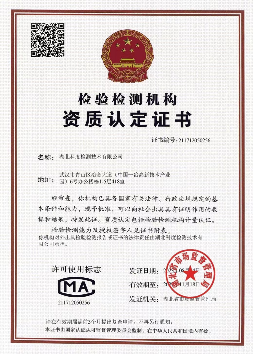 湖北科度檢測(cè)技術(shù)有限公司是一家專業(yè)從事環(huán)境類及相關(guān)領(lǐng)域檢測(cè)的第三方檢測(cè)機(jī)構(gòu),公司已通過湖北省市場(chǎng)監(jiān)督管理局CMA計(jì)量認(rèn)證,可以面向社會(huì)出具權(quán)威CMA檢測(cè)報(bào)告。 我公司實(shí)驗(yàn)室嚴(yán)格按照國(guó)家標(biāo)準(zhǔn)建設(shè),擁有一大批國(guó)內(nèi)外先進(jìn)儀器設(shè)備及現(xiàn)代化配套設(shè)施,并有經(jīng)驗(yàn)豐富的中高級(jí)專業(yè)技術(shù)人員和嚴(yán)格的實(shí)驗(yàn)室質(zhì)量保證體系為項(xiàng)目運(yùn)作提供強(qiáng)力支撐。 作為第三方檢測(cè)機(jī)構(gòu),公司始終以高度的社會(huì)責(zé)任感經(jīng)營(yíng)企業(yè),以“公正、嚴(yán)謹(jǐn)、高效”為宗旨,依托專業(yè)的技術(shù)實(shí)力為客戶提供專業(yè)優(yōu)質(zhì)檢測(cè)服務(wù),受到政府、企業(yè)和社會(huì)各界的廣泛關(guān)注和認(rèn)可。